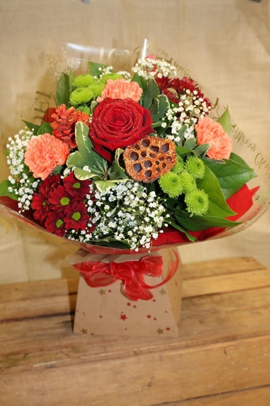 Lovely festive gift bag of seasonal flowers in Reds Copper and Green